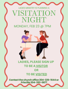 Save the date – Feb.23! We are planning a ladies service night – sign up with Priscilla or Lisa at the office if you would like to visit someone or have someone come visit you!